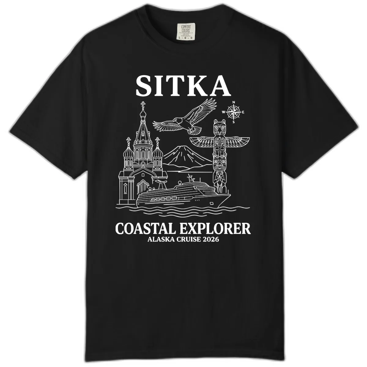 Embrace the relaxed vibe of your Alaska cruise with the Sitka Coastal Explorer Alaska Cruise Comfort Color tee. This shirt is designed for ultimate comfort, featuring a beautifully rendered monochromatic line-art illustration of Sitka's most cherished sights. From the iconic Russian Orthodox church and totem pole to the majestic Mount Edgecumbe and a majestic bald eagle, it’s a wearable piece of art that captures the soul of your destination. Perfect for those who value both comfort and a great story.