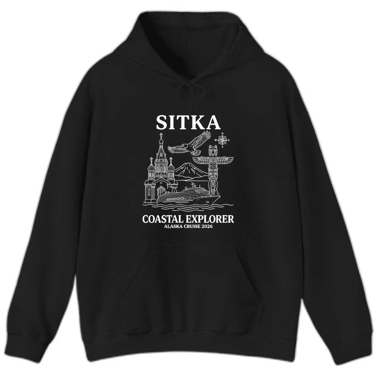 Stay warm and stylish on your Alaskan voyage with the Sitka Coastal Explorer Alaska Cruise Hoodie. This hoodie features a striking monochromatic line-art design, bringing the heart of Sitka to life. Marvel at the detailed depiction of the Russian Orthodox church, the powerful totem pole, the soaring bald eagle, and the iconic Mount Edgecumbe volcano. It's the ultimate wearable souvenir, perfect for capturing the spirit of your coastal exploration and keeping you comfortable through every adventure.