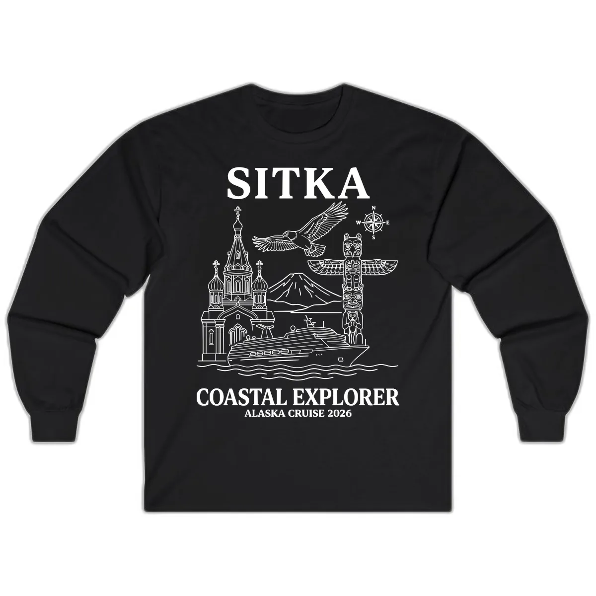 Gear up for your Alaskan adventure with the Sitka Coastal Explorer Alaska Cruise Long Sleeve shirt. This tee features a captivating monochromatic line-art illustration that vividly portrays the essence of Sitka, Alaska. From the soaring bald eagle and iconic totem pole to the distinct Russian Orthodox church and the formidable Mount Edgecumbe, this design is a tribute to the rich culture and stunning landscapes you'll encounter. It's the perfect companion for cooler days and memorable shore excursions.