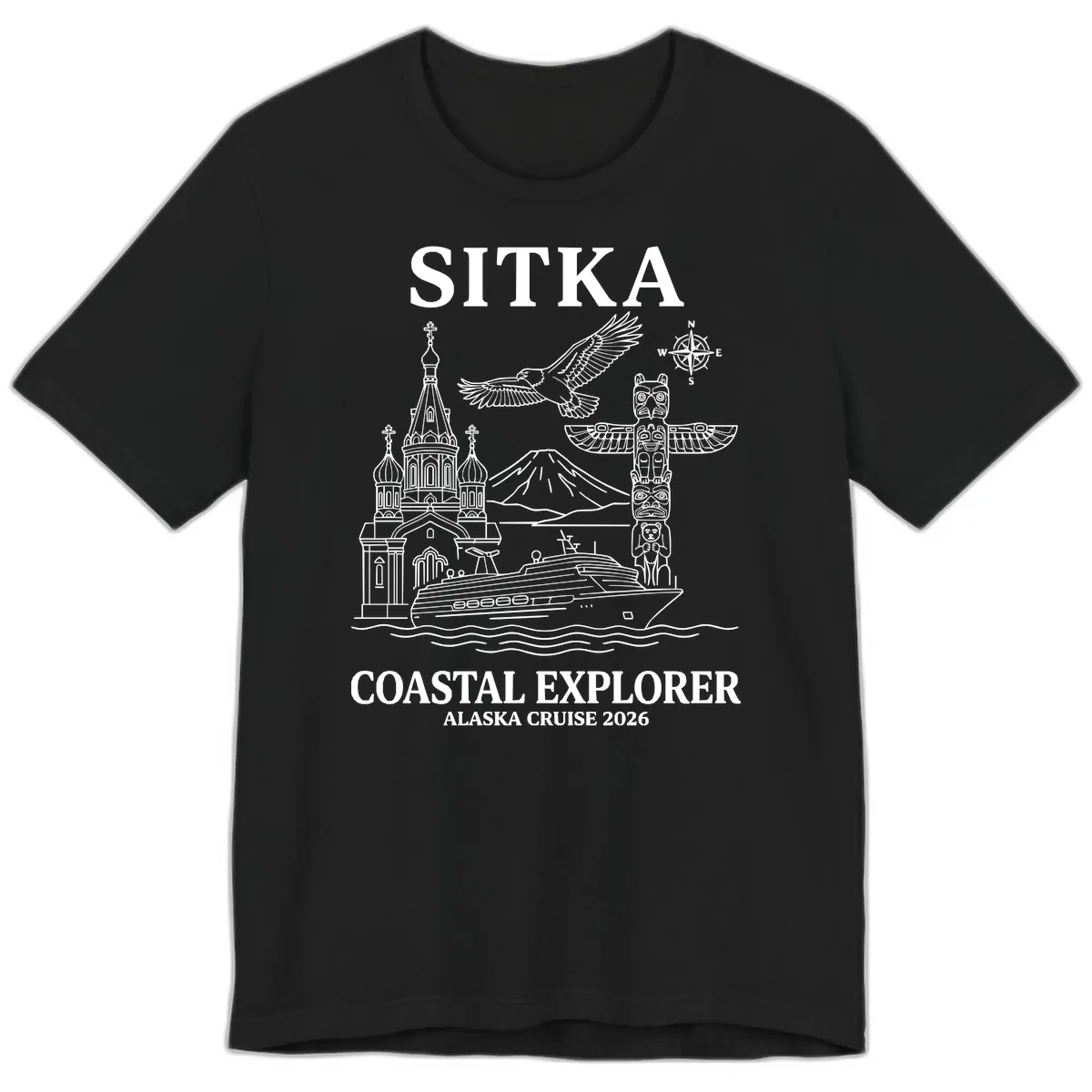 Elevate your Alaska cruise wardrobe with the Sitka Coastal Explorer Alaska Cruise Premium T-Shirt. This premium tee boasts a meticulously crafted monochromatic line-art design, weaving together the essence of Sitka. Imagine the striking silhouette of Mount Edgecumbe, the cultural depth of a totem pole, the grace of a bald eagle, and the distinct charm of a Russian Orthodox church – all captured to celebrate your journey through the stunning Alaskan coast.