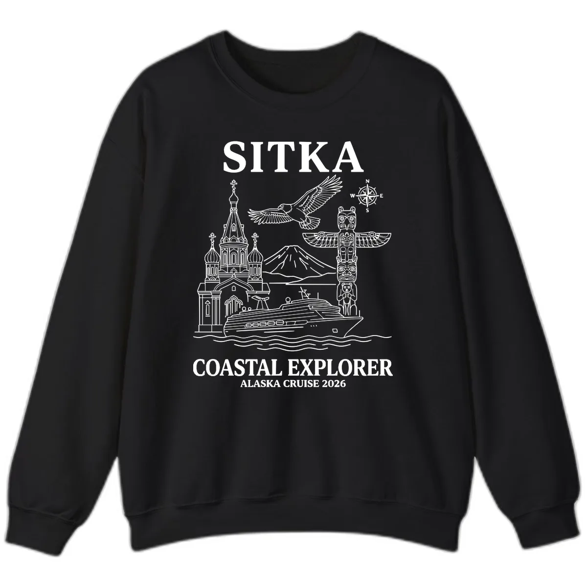 Wrap yourself in the spirit of Alaska with the Sitka Coastal Explorer Alaska Cruise Sweatshirt. This cozy crewneck features a detailed monochromatic line-art illustration, celebrating the iconic landmarks of Sitka. From the soaring bald eagle and intricate totem pole to the distinctive Russian Orthodox church and the majestic Mount Edgecumbe volcano, this design is a beautiful tribute to your unforgettable cruise adventure. It’s the perfect way to stay warm and stylish while reliving your favorite Alaskan memories.