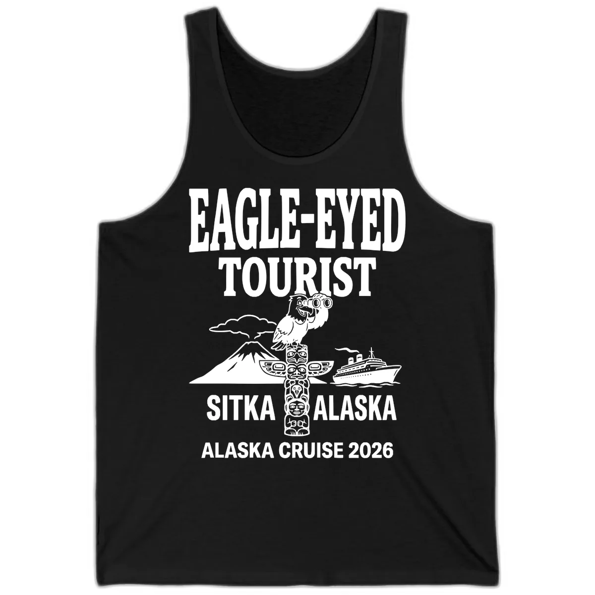 - ✓ Features "EAGLE-EYED TOURIST SITKA ALASKA ALASKA CRUISE 2026" text.