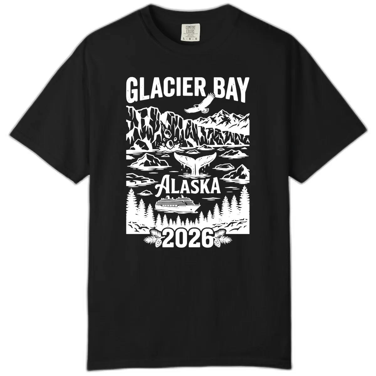 The scenic Glacier Bay Alaska 2026 design, featuring glaciers, an eagle, whale tail, and cruise ship, looks fantastic on the Comfort Color's relaxed fabric, giving it a classic, vintage vibe.