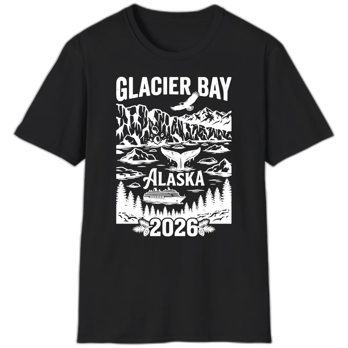 This t-shirt features a scenic monochromatic illustration of Glacier Bay, Alaska. It includes iconic imagery like glaciers, a bald eagle, whale tail, a cruise ship, and evergreen trees, all celebrating a 2026 voyage.