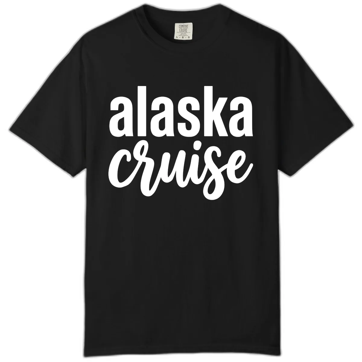 The bold, oversized 'alaska cruise' typography in white stands out vibrantly against the distinct, slightly washed look of the Comfort Colors fabric, giving it a unique, stylish appeal.