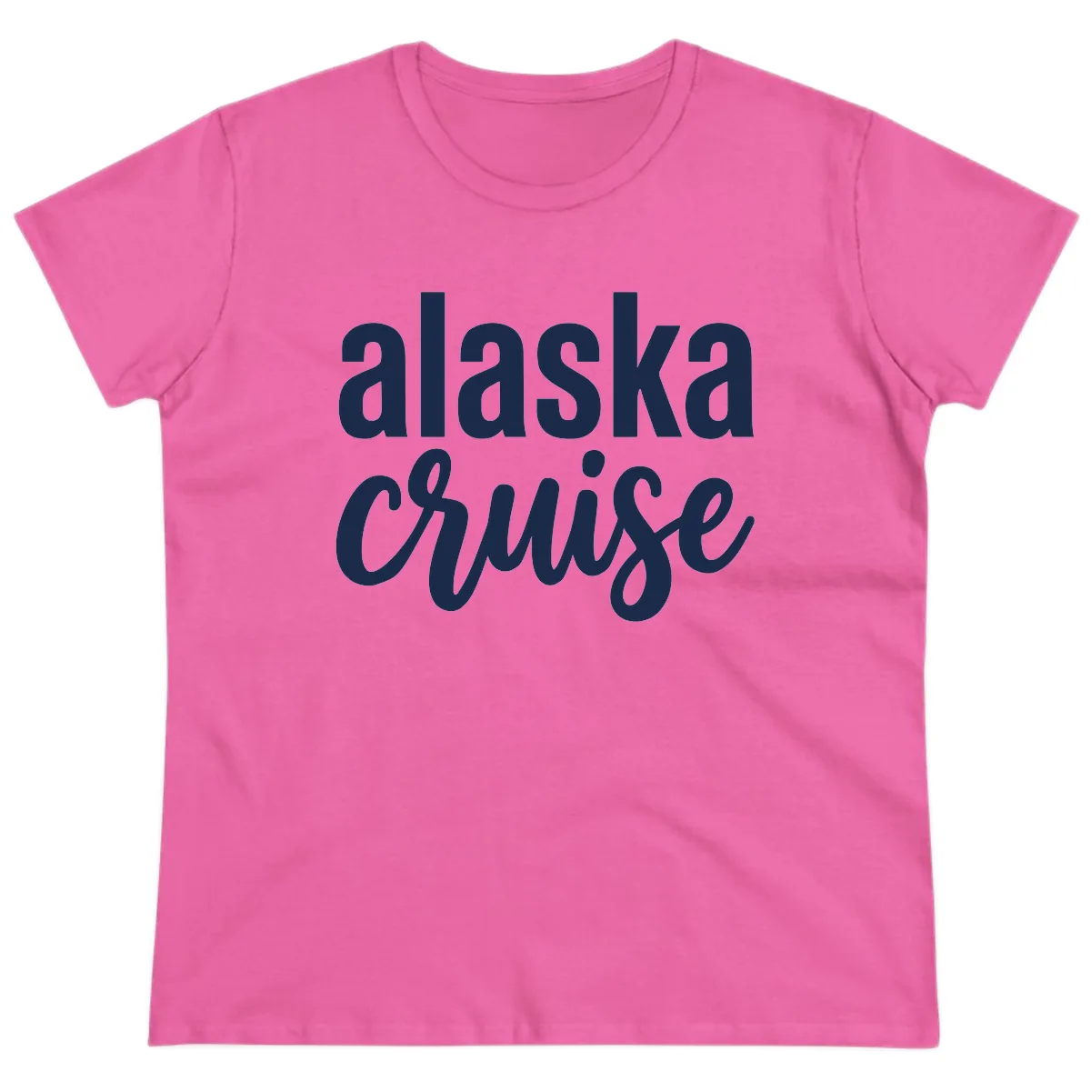 The large white 'alaska cruise' lettering creates a strong, modern statement that pairs well with the feminine cut of the tee, making it a stylish choice for your vacation.
