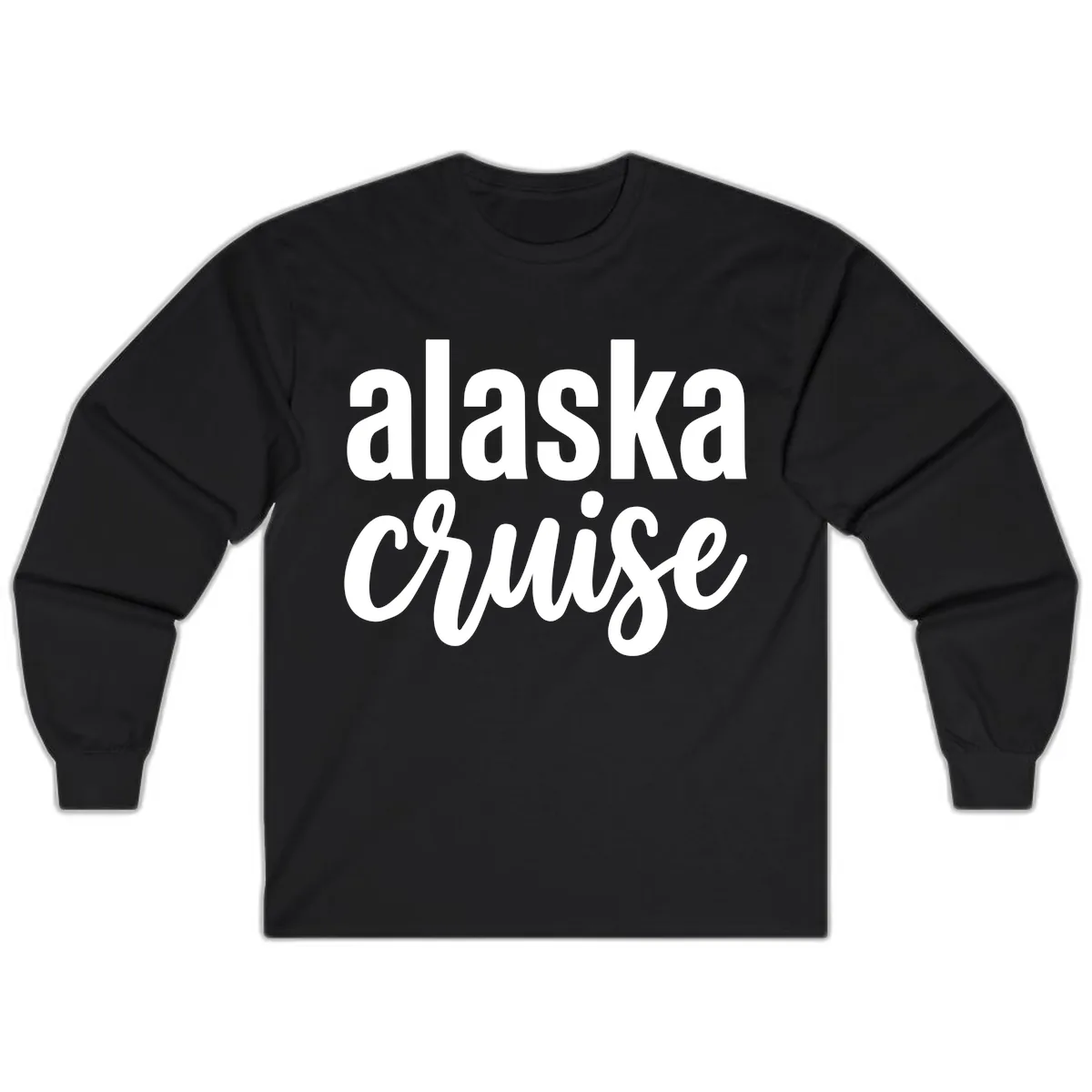 The bold, oversized 'alaska cruise' typography is prominently featured, offering a strong visual statement that transitions well to the longer sleeves and torso of this shirt.