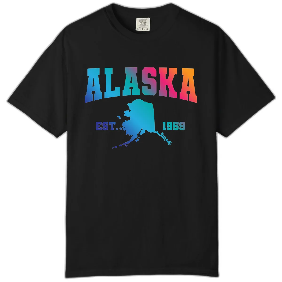The vibrant gradient colors of the 'ALASKA' text and the detailed Alaska map silhouette pop beautifully on the garment-dyed fabric of the Comfort Color tee, offering a unique, lived-in look.