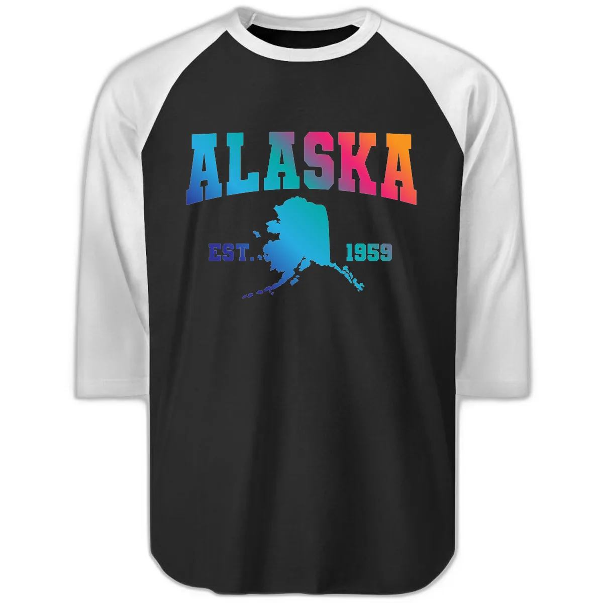 The vibrant blue-to-orange-to-pink gradient 'ALASKA' text arches boldly over the teal Alaska map, with the 'EST. 1959' text below, all complemented by the distinct look of the raglan sleeves.