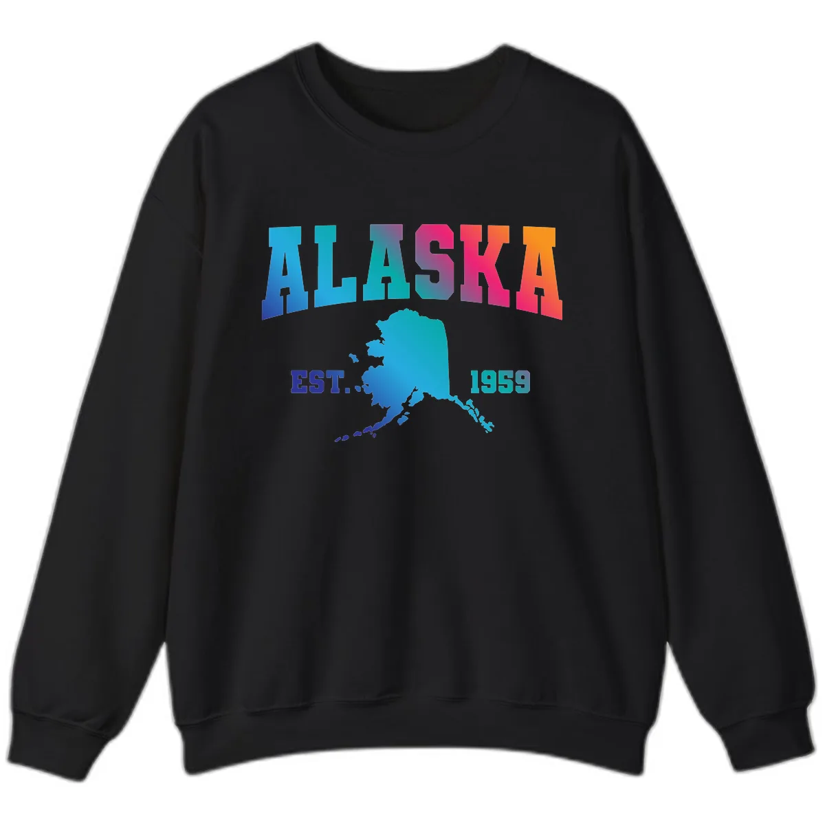 The bold 'ALASKA' text in its striking blue-to-orange-to-pink gradient, along with the teal Alaska map and 'EST. 1959' text, are printed clearly on the sweatshirt fabric, creating a visually appealing piece.