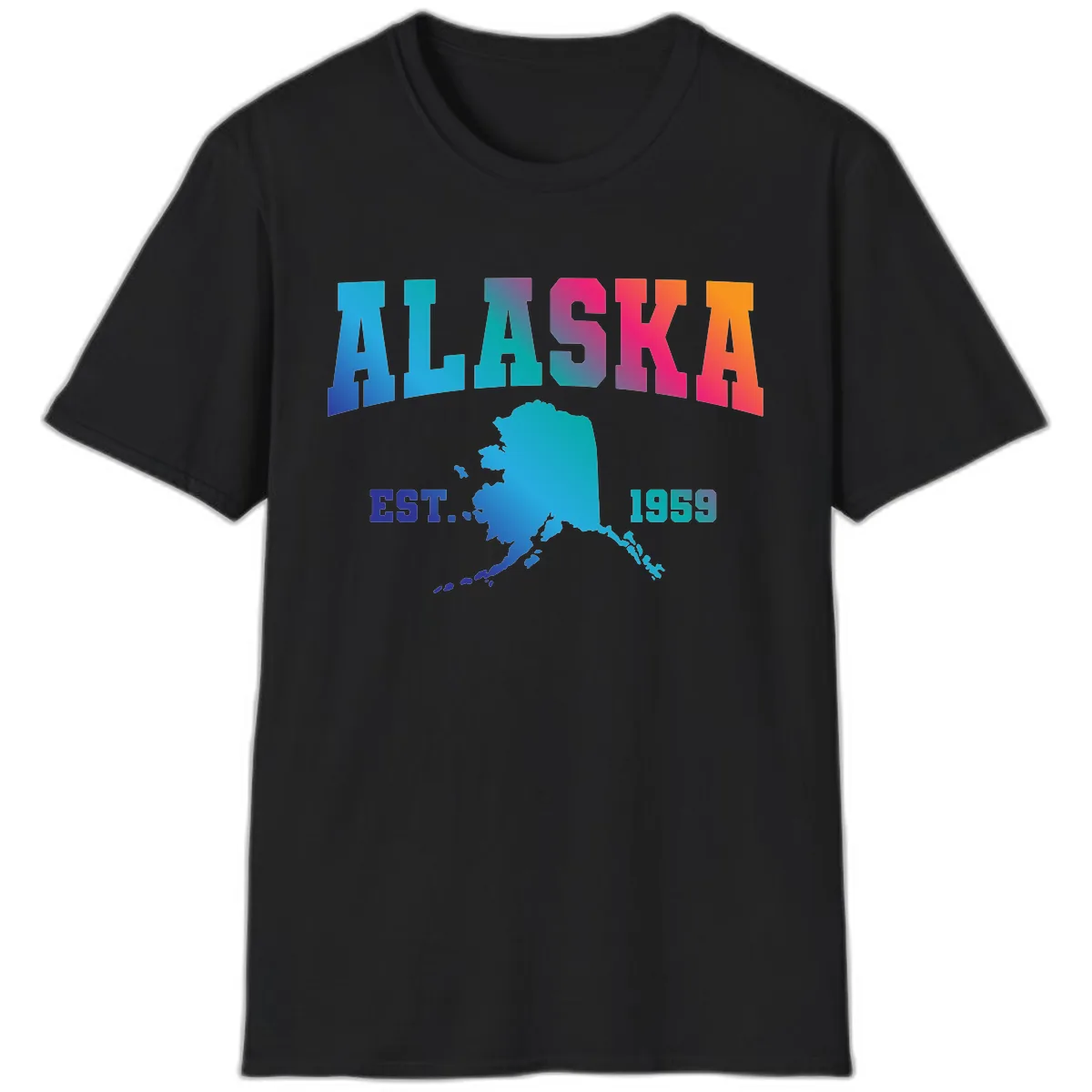 This T-shirt features a bold, vibrant gradient design of 'ALASKA EST. 1959' arching over a teal Alaska map silhouette. It's a unique way to showcase your state pride and commemorate your trip.
