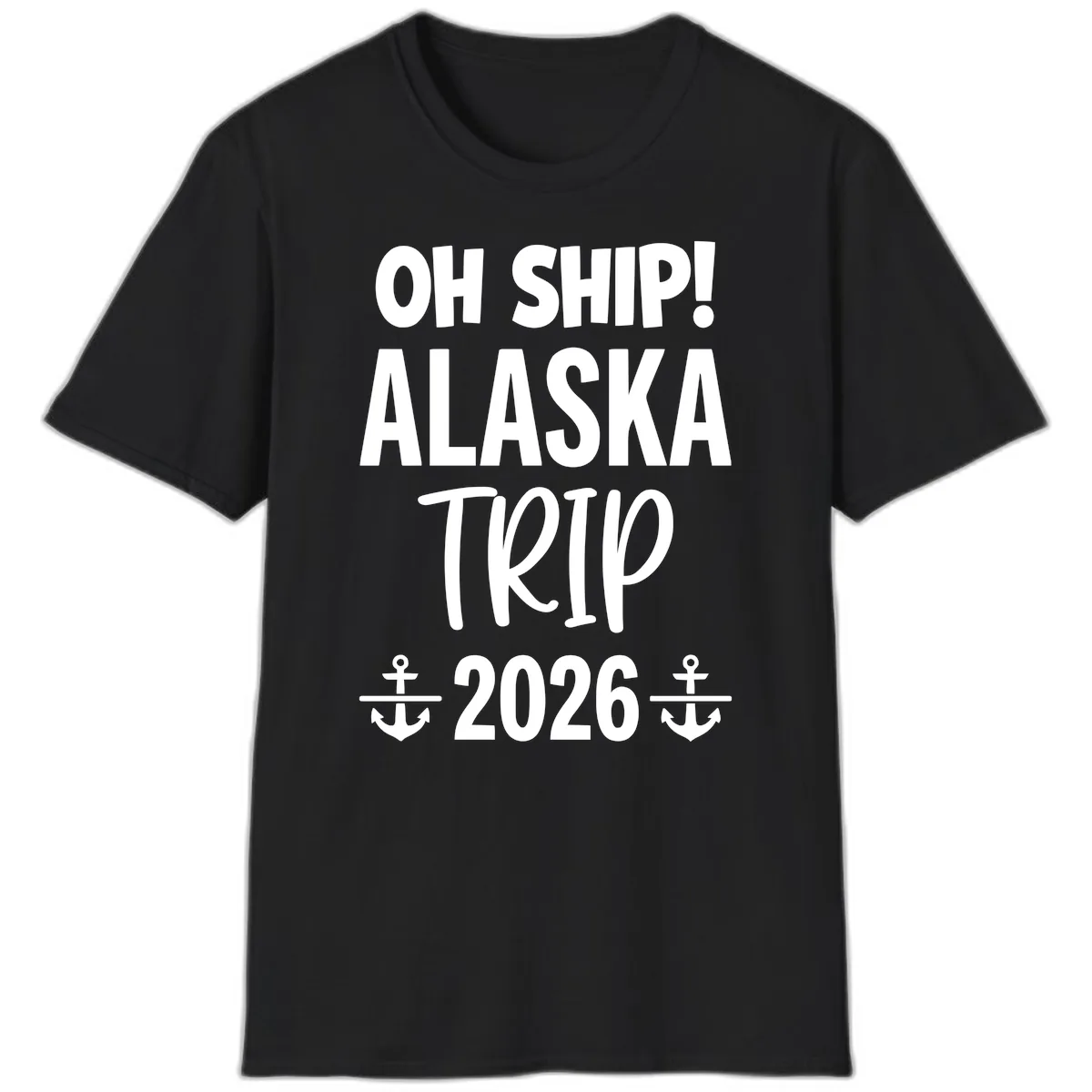 Get ready for an unforgettable adventure with the "Oh Ship Alaska Trip 2026" T-Shirt! This tee is all about embracing the fun and humor of your Alaskan cruise. Featuring a bold, eye-catching design with the iconic "OH SHIP!" pun, it's the perfect way to signal your vacation mode has officially begun. The crisp white lettering against a cool gray background, accented with nautical anchors, makes this shirt a standout.
