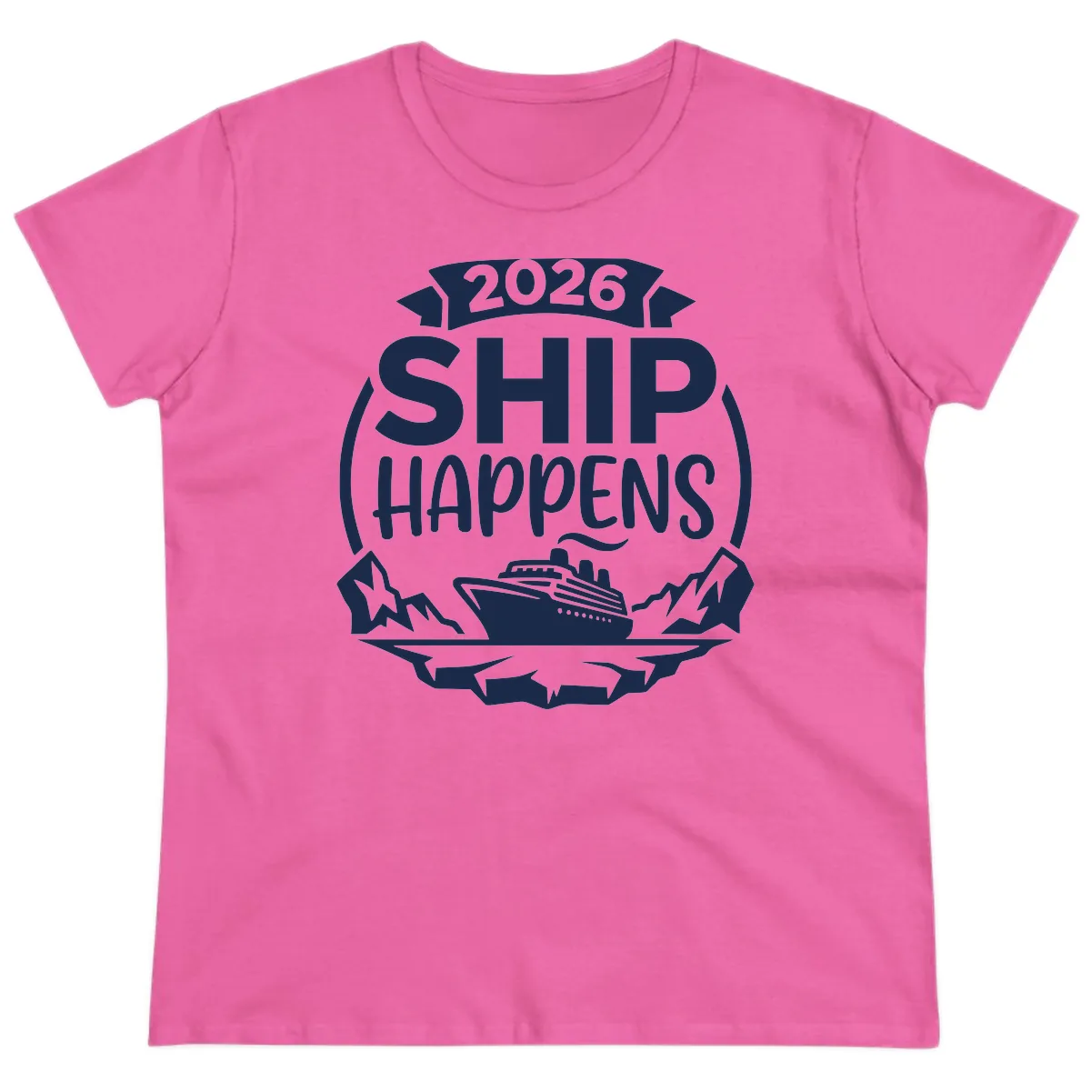 Ladies, get ready for a cruise filled with laughs and style with our '2026 Ship Happens Cruise Badge' Ladies Tee! Designed to flatter with a more tailored fit, this shirt features our hilarious 'Ship Happens' slogan wrapped in a cool badge design, complete with a cruise ship sailing past snowy peaks. It’s the perfect way to show off your sense of humor and your love for cruising on your 2026 Alaska adventure.