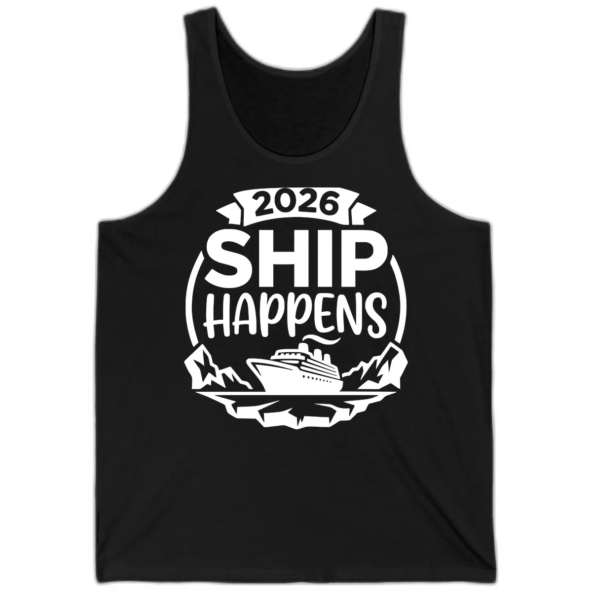 The bold badge design, featuring '2026 SHIP HAPPENS', a cruise ship, mountains, and stars, is printed clearly on the front, making a fun statement on this casual tank.