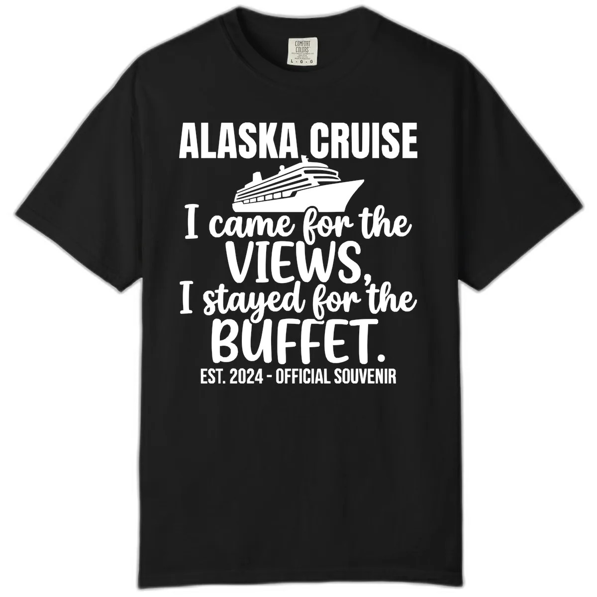 Experience ultimate comfort on your Alaska cruise with this "Came For The Views, Stayed For The Buffet" Comfort Colors tee. This shirt perfectly blends relaxed style with a dose of cruise humor, featuring a classic cruise ship graphic and the unforgettable declaration that the buffet is the true star. It's the ideal way to commemorate your journey with a shirt that feels as good as it looks, embodying the laid-back spirit of vacation.