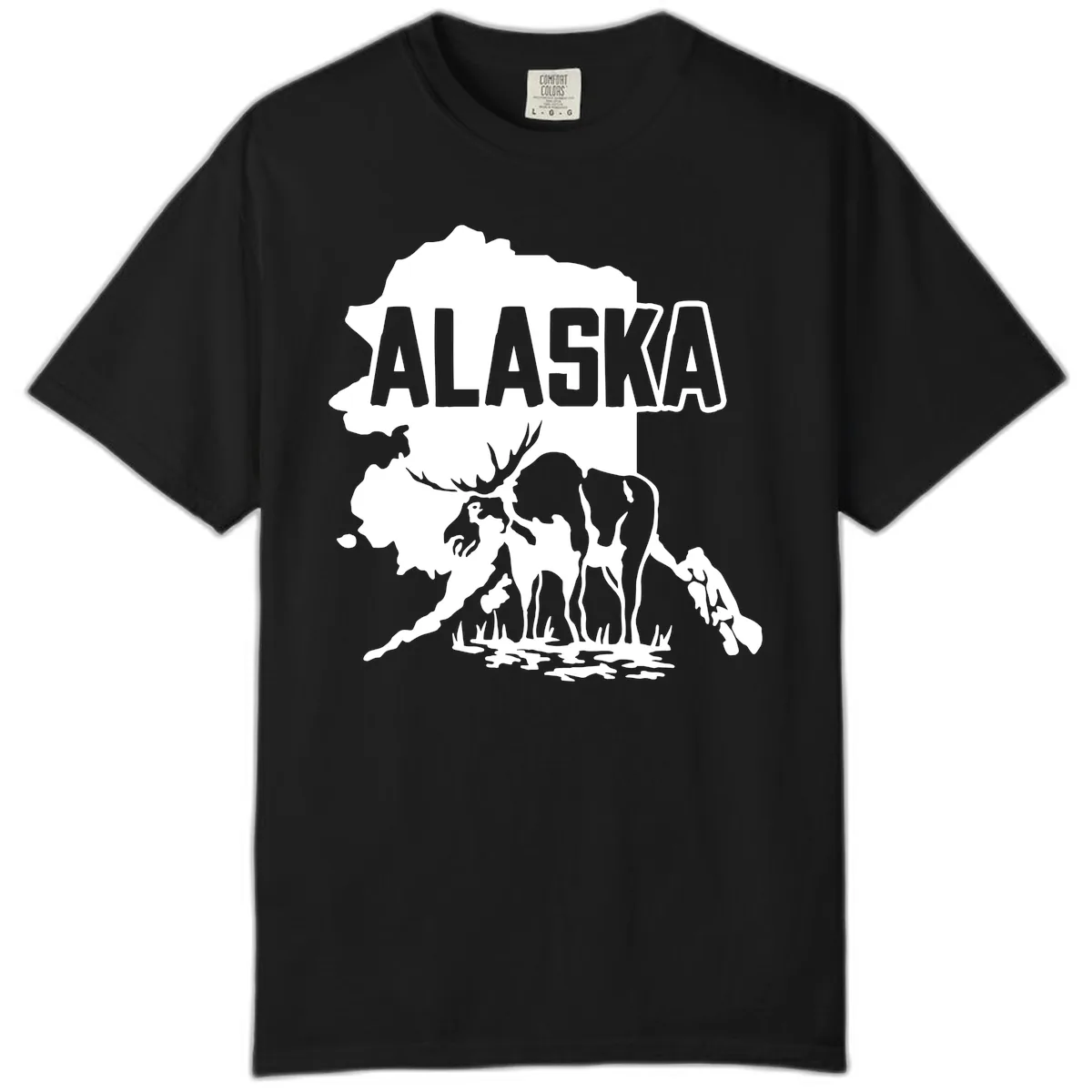 The printing on Comfort Colors holds detail well, so the intricate illustrations of the moose, bear, eagle, and the Alaska map will be clearly visible and add character to the garment-dyed base.