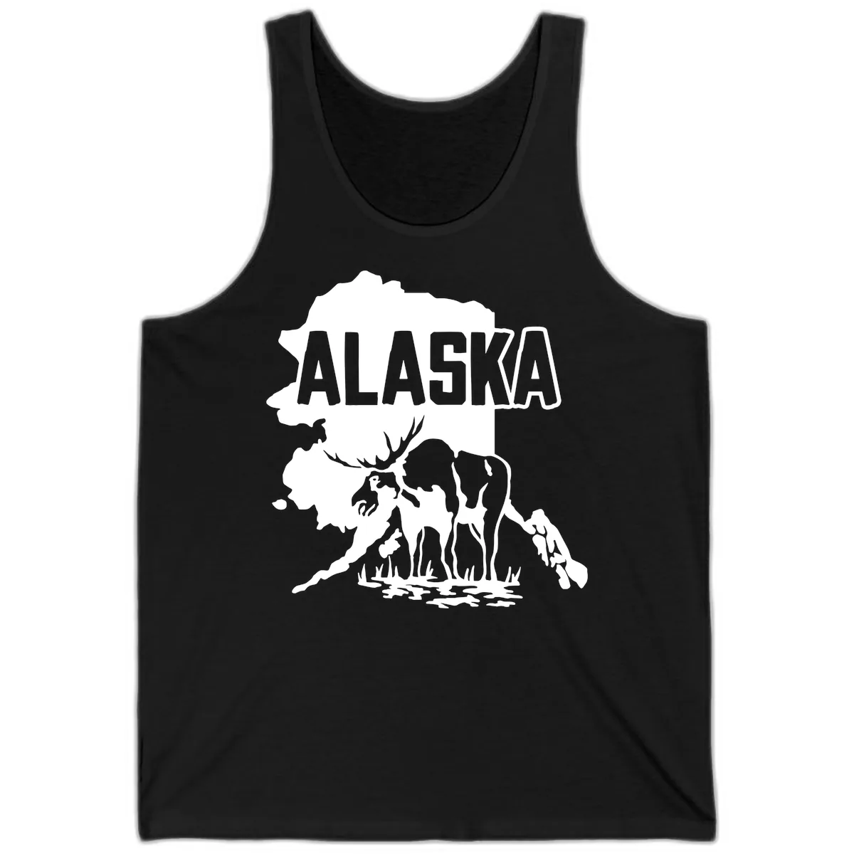 The detailed illustration of the Alaska state map filled with wildlife—moose, bear, and eagle—is printed on the front of the tank top, offering a vibrant and eye-catching display of your Alaskan adventure.