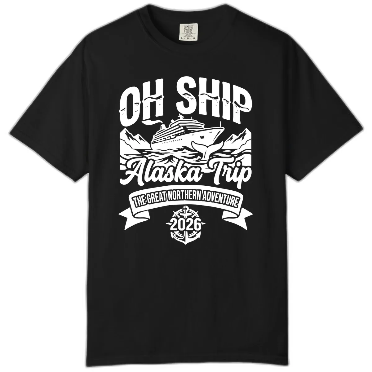 Embrace the relaxed vibes of your "Off Ship Alaska Trip" with this super-comfy Comfort Colors tee! Designed for your "Great Northern Adventure 2026," this shirt features a fantastic vintage badge graphic. Picture a classic cruise ship navigating Alaskan waters, framed by snowy peaks, a playful whale tail, and dynamic ocean waves. It’s the ultimate blend of retro style and adventure spirit, perfect for making memories.