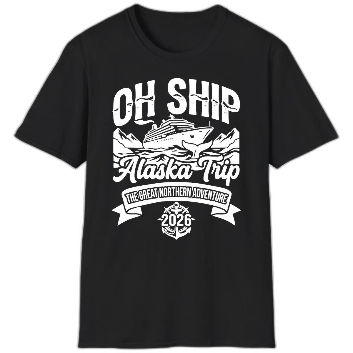 Ready to trade the ship for the wild? This "Off Ship Alaska Trip" tee captures the spirit of your 2026 Great Northern Adventure with a cool vintage badge design. Featuring a classic cruise ship sailing through Alaskan waters alongside majestic mountains, a playful whale tail, and rolling ocean waves, it's the perfect way to commemorate your off-ship excursions.