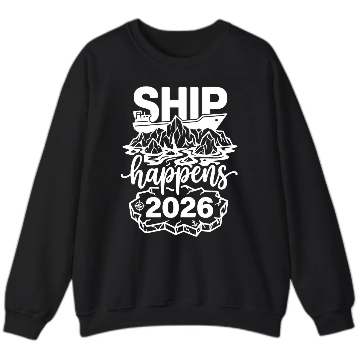 Stay warm and witty on your 2026 Alaska cruise with the 'Ship Happens Alaska Cruise 2026 Sweatshirt'! This cozy crewneck is your perfect companion for chilly Alaskan days and nights. The design features the unforgettable 'SHIP happens' pun, humorously illustrated with a cruise ship navigating icy waters beneath majestic mountains and icebergs. It’s the ultimate blend of comfort, style, and laugh-out-loud humor for your adventure.