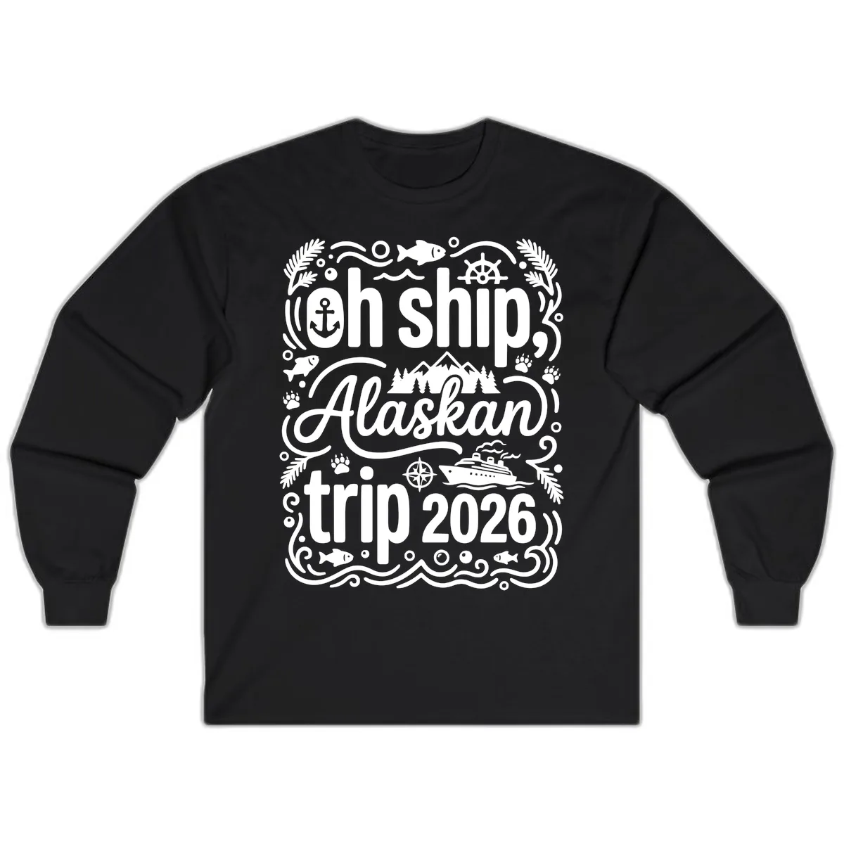 The detailed 'Oh Ship, Alaskan trip 2026' design, with its cruise ship, anchor, mountains, and other elements, stands out clearly on the long sleeves. It's a great way to keep the fun theme visible even in cooler weather.