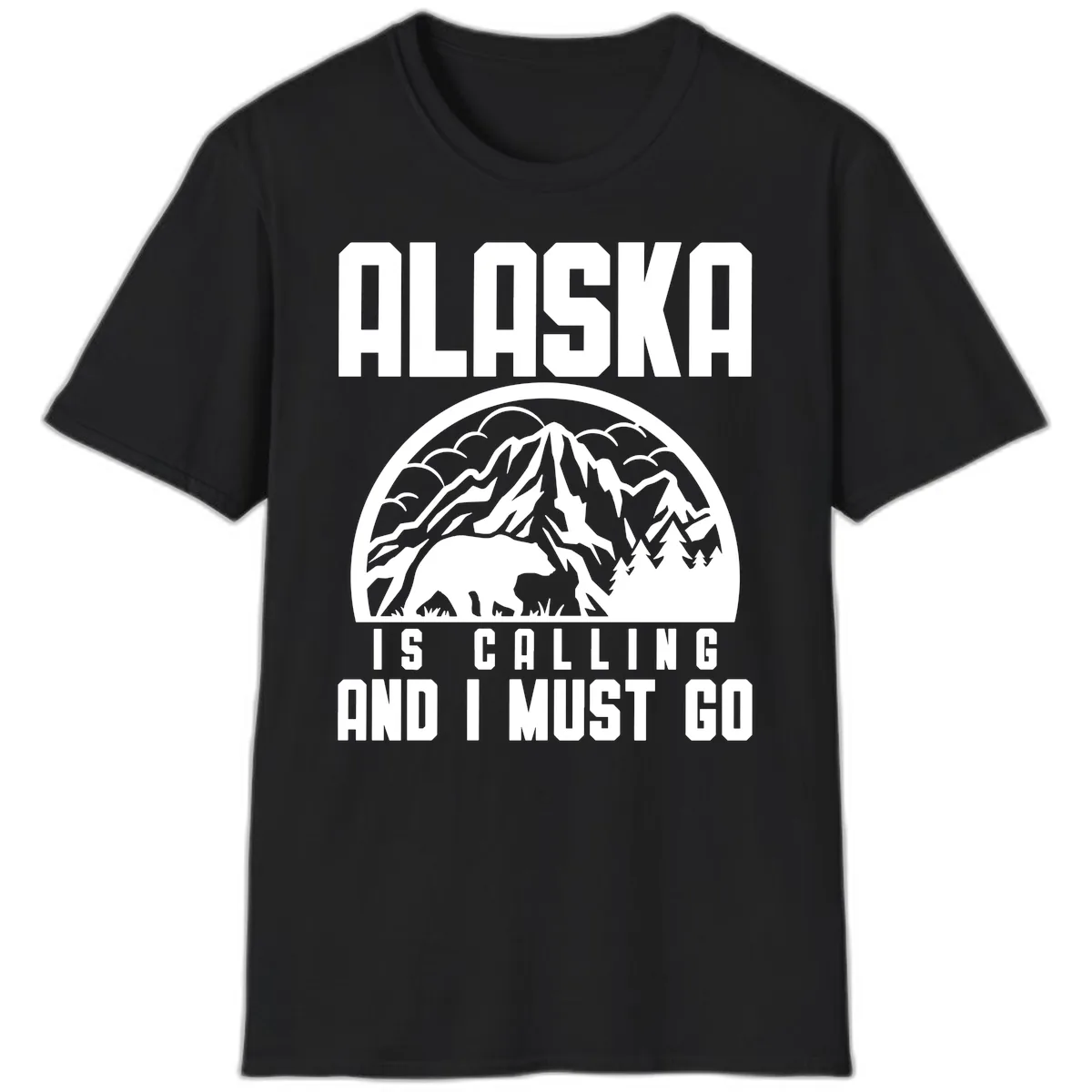 The design features a bold, vintage-style badge with a snow-capped mountain, bear silhouette, and evergreen trees. The text 'ALASKA IS CALLING AND I MUST GO' is prominently displayed in block lettering.