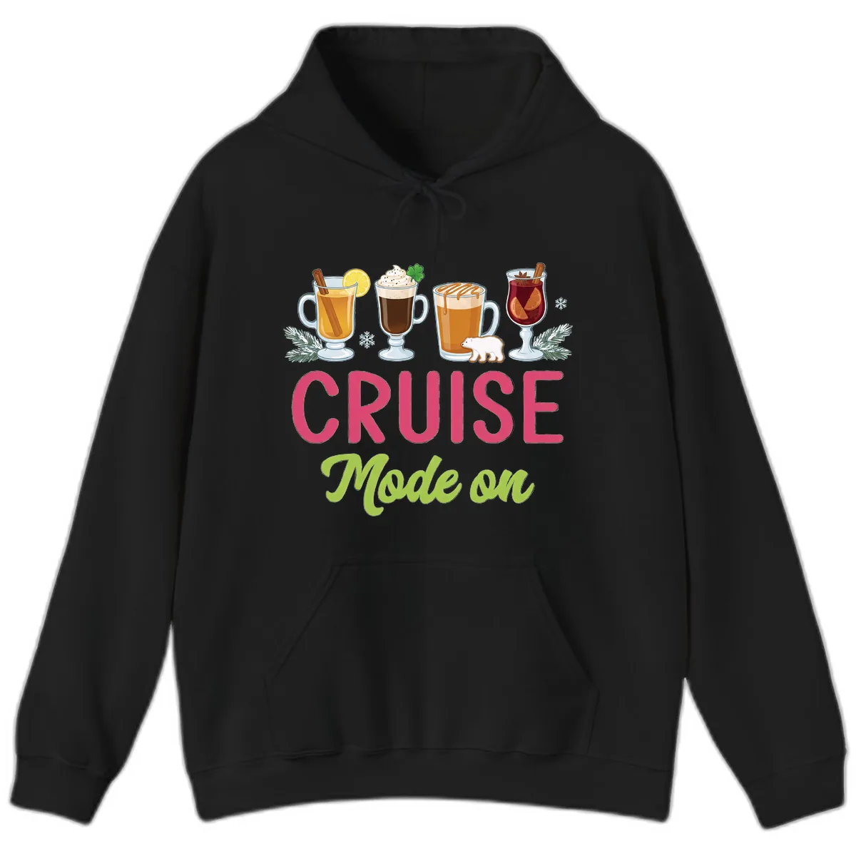 The hoodie prominently displays the 'CRUISE Mode On' text in bold pink and green, accompanied by an illustration of four festive winter holiday beverages: hot toddy, Irish coffee, caramel macchiato, and mulled wine.