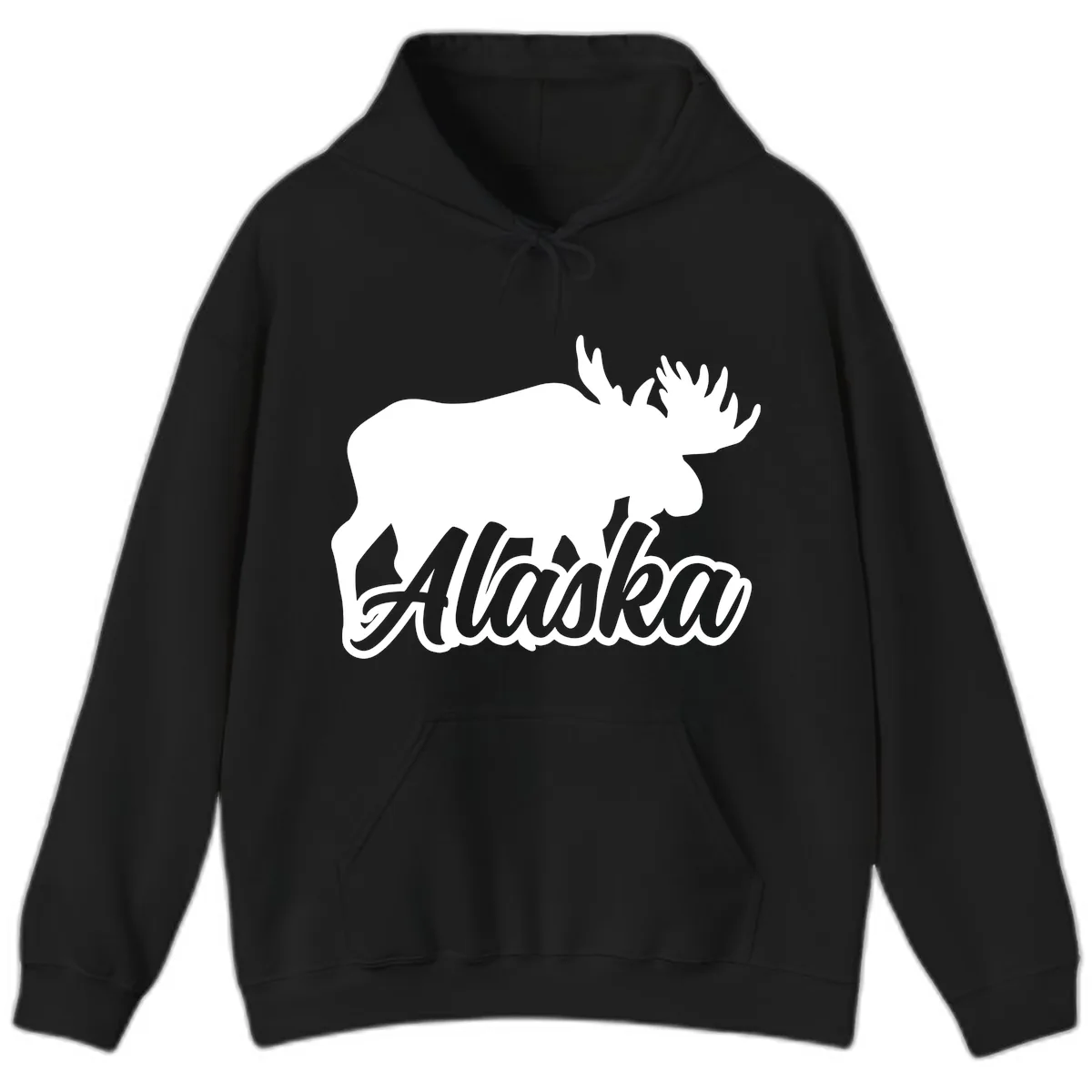 The striking white moose silhouette and stylized gray 'Alaska' lettering are prominently displayed on the front, creating a bold statement that captures the spirit of your trip.