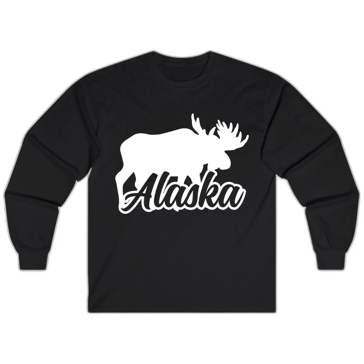 Stay comfortable and stylish on your Alaskan adventure with the Moose Alaska Silhouette Long Sleeve shirt. This design features a striking white moose silhouette paired with stylized gray 'Alaska' lettering, offering a bold yet minimalist look. It’s the ideal choice for cooler days and evenings as you navigate the stunning landscapes of the Last Frontier.