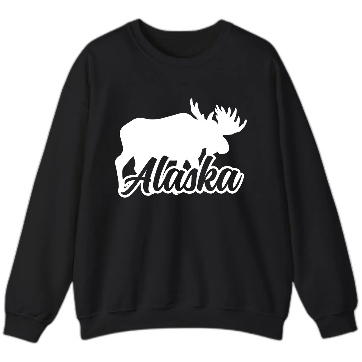The bold white moose silhouette and gray 'Alaska' lettering stand out vibrantly on the sweatshirt fabric, offering a clear and impactful design that’s perfect for your vacation.