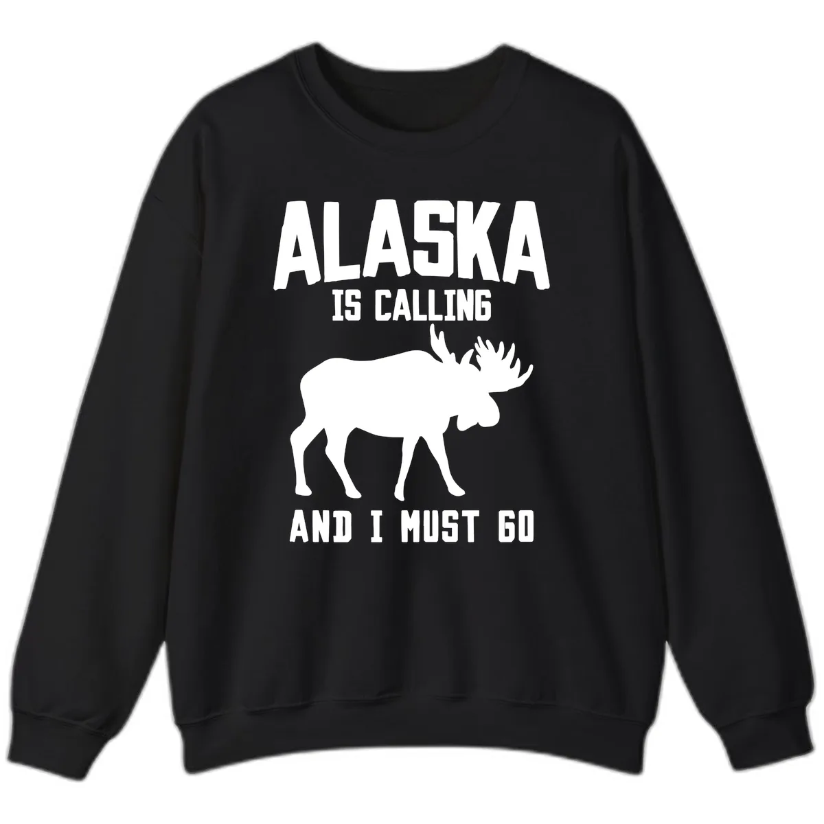 Yes, the bold, minimalist moose silhouette and the 'ALASKA IS CALLING AND I MUST GO' text create a striking graphic that stands out beautifully on this cozy sweatshirt. It’s a fun way to represent your travel spirit.