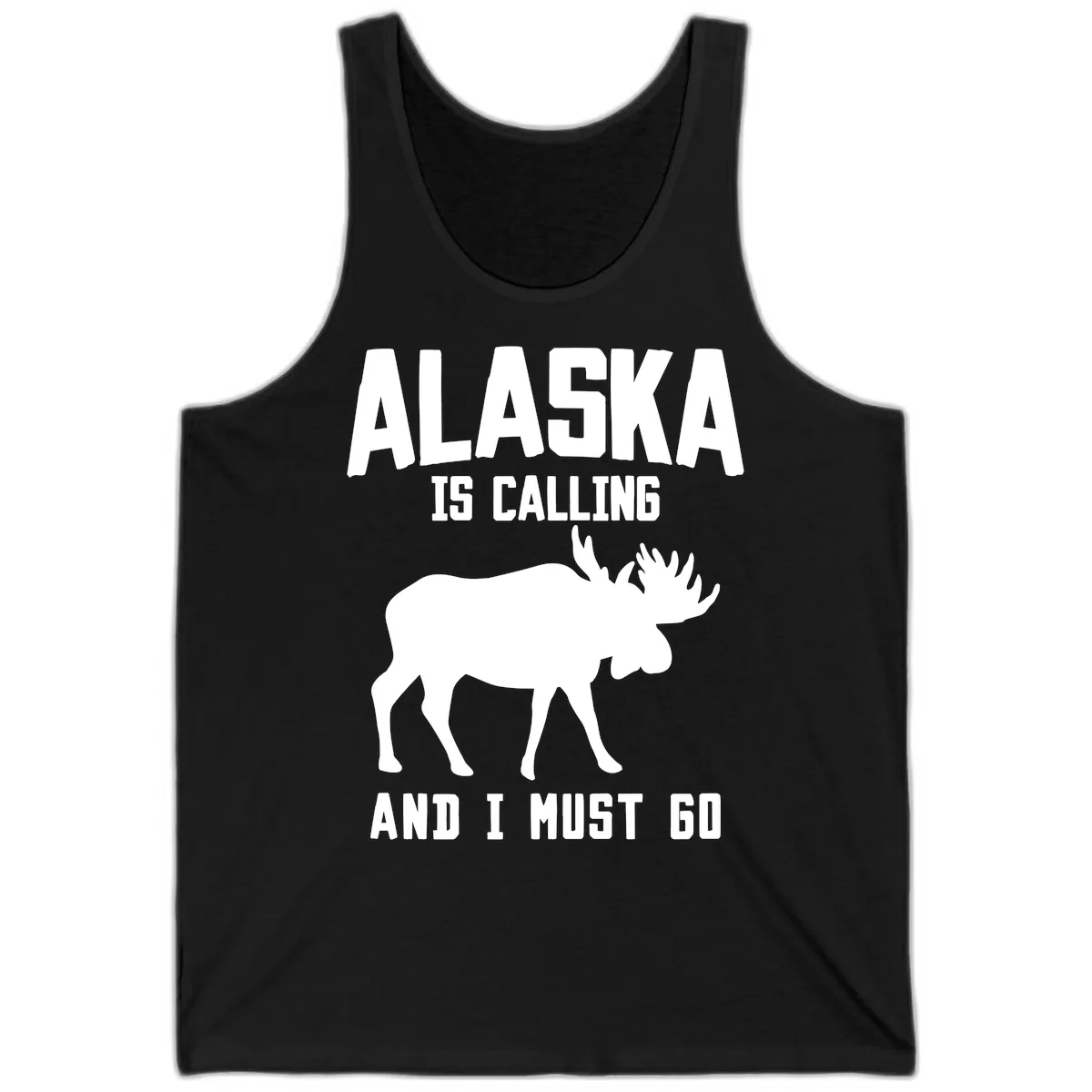 The bold, minimalist moose silhouette and the 'ALASKA IS CALLING AND I MUST GO' text are printed on the front of this tank. It makes for a fun, eye-catching graphic that celebrates your Alaska adventure.