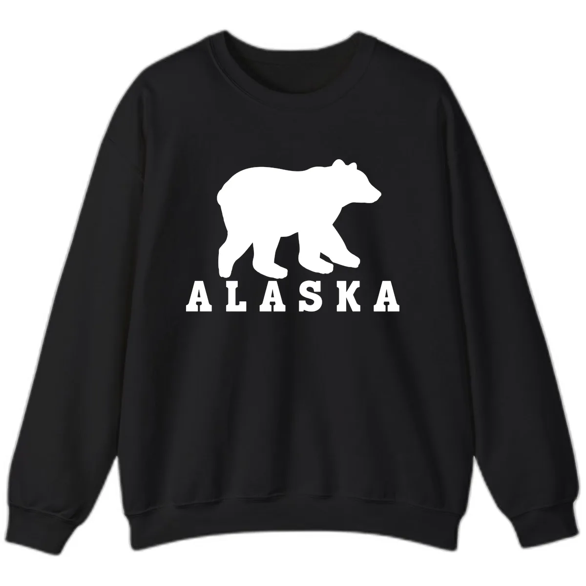 The bold white bear silhouette and 'ALASKA' text are printed clearly on the sweatshirt, creating a striking contrast that stands out. It’s a great way to showcase your Alaskan theme.