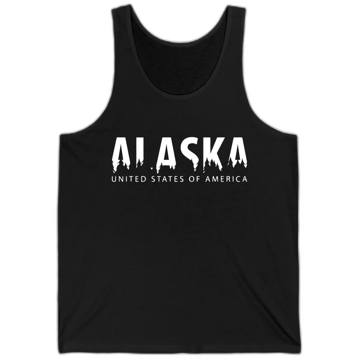 The tank features a bold design with white lettering spelling 'ALASKA', integrated pine tree silhouettes, and the outline of Alaska. The subtitle 'UNITED STATES OF AMERICA' is also included, celebrating your destination.