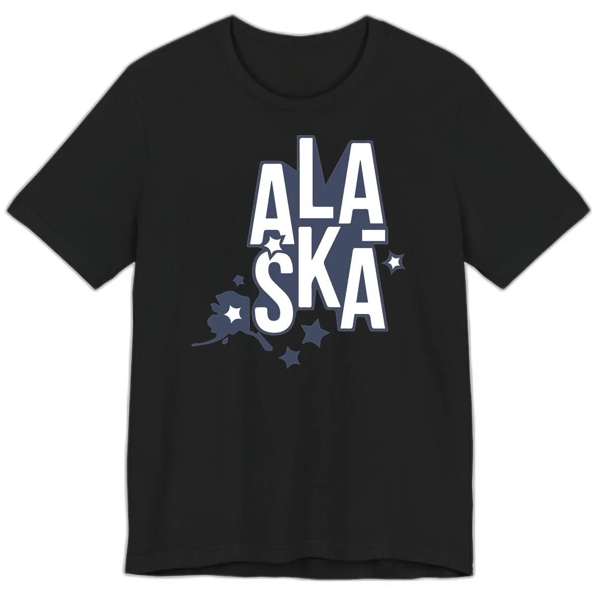 - ✓ Oversized, outlined "ALASKA" text with decorative stars.