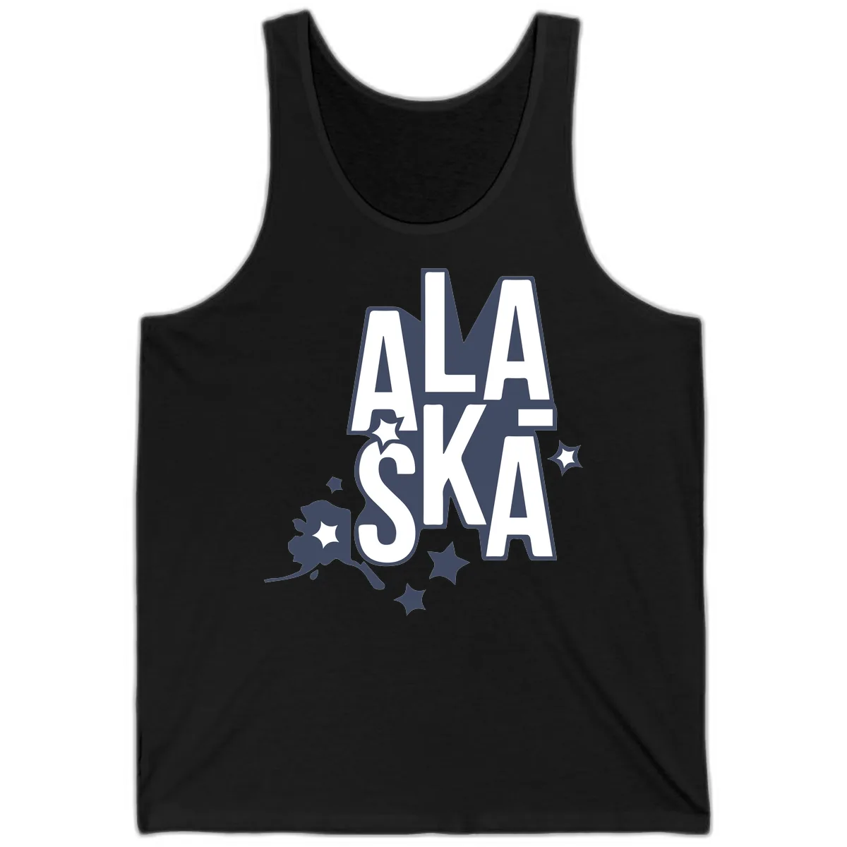 The bold, outlined 'ALASKA' lettering, decorative stars, and floral accent are printed clearly on this tank, making it a vibrant and fun statement piece perfect for sunny cruise days.