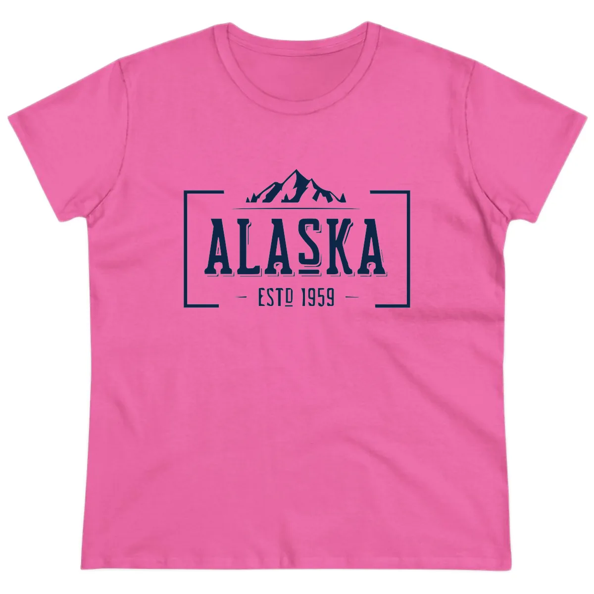 The classic vintage badge, with its mountain range and 'ALASKA ESTD 1959' text, looks stylish and adventurous on this ladies' fit tee, offering a great way to represent your Alaska cruise.