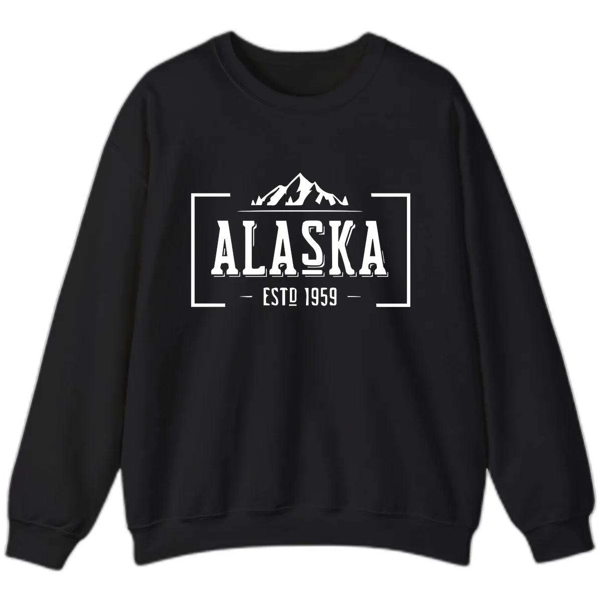 The classic vintage badge design, featuring the snow-capped mountains and 'ALASKA ESTD 1959' text, looks bold and timeless on the sweatshirt, offering a cozy yet stylish representation of Alaska.