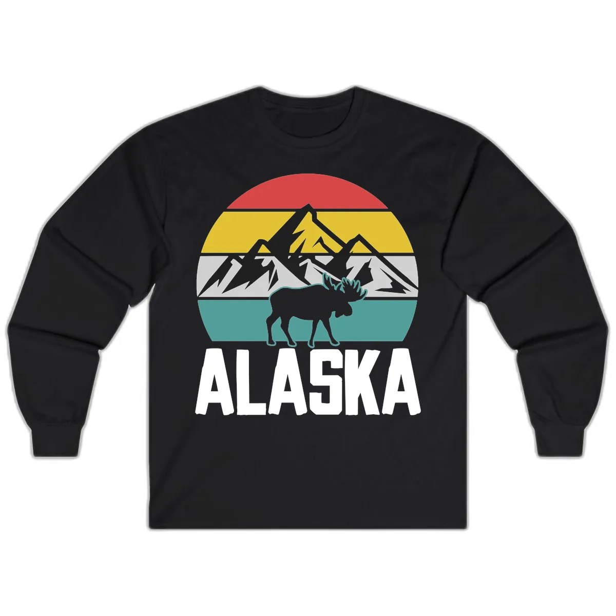 Stay comfortable and stylish on your Alaskan adventure with the Moose Mountain Alaska Badge Long Sleeve. This tee features a striking circular badge design, complete with a powerful moose silhouette set against horizontal bands of red, gold, gray, and teal, representing the Alaskan sky, forest, mountains, and water. It’s the perfect way to carry the spirit of the wild with you.