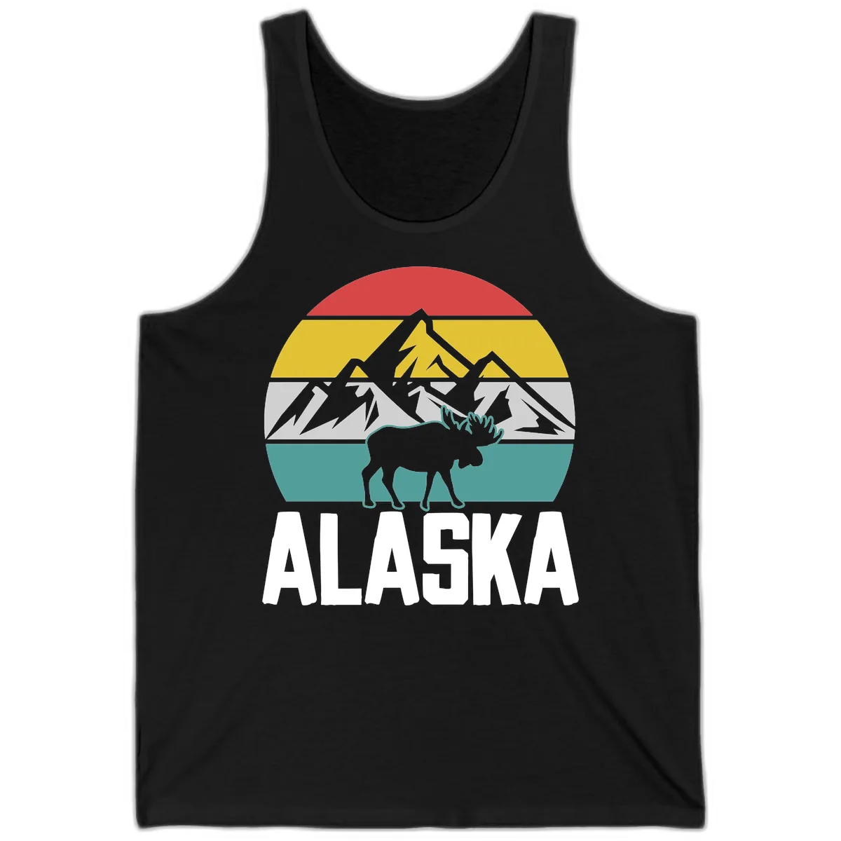 Soak up the Alaskan sun in our Moose Mountain Alaska Badge Tank! This breezy top features a vibrant circular badge design, showcasing a striking moose silhouette against a colorful layered landscape of red, gold, gray, and teal, evoking the stunning Alaskan wilderness. It’s the perfect lightweight souvenir for your cruise adventure.