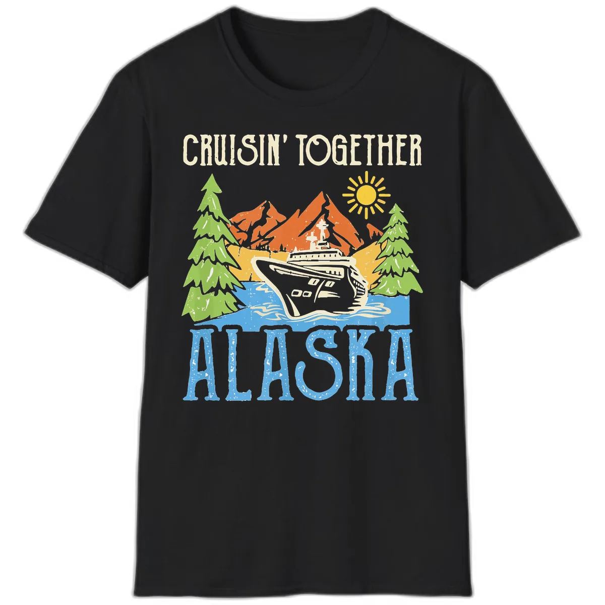 This t-shirt showcases a vibrant scenic illustration of a cruise ship sailing through an Alaskan landscape. You'll see snow-capped mountains, lush evergreen forests, and flowing water, capturing the essence of your adventure.