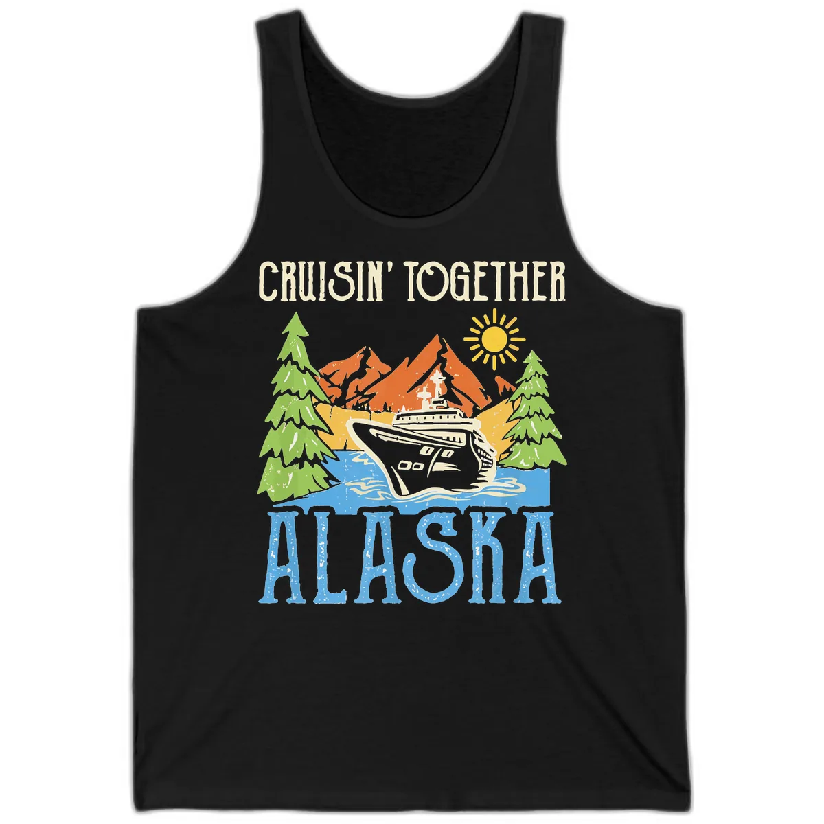 Embrace the warmer days on your Alaskan cruise with our "Cruisin' Together Alaska" Tank Top. This breezy tank features a vibrant, vintage-inspired illustration of a cruise ship sailing past stunning snow-capped mountains and evergreen forests. The bold "Cruisin' Together Alaska" text is perfect for capturing those fun-filled group moments and making lasting memories. It’s the ultimate way to stay cool and stylish while celebrating your adventure.