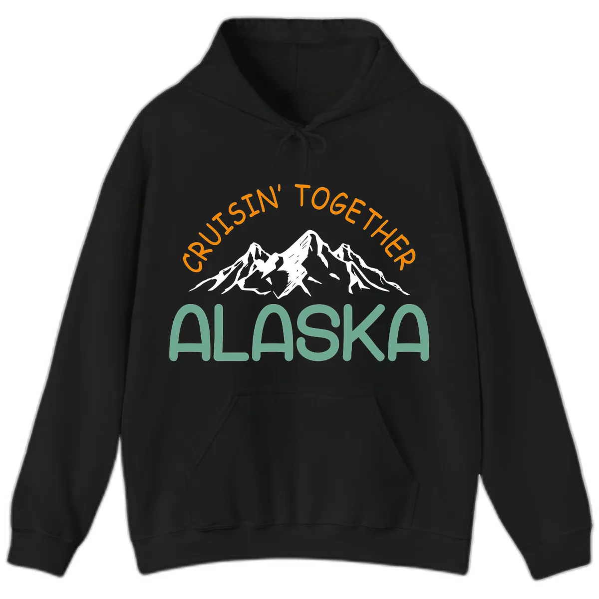 The vibrant orange and teal typography of the 'CRUISIN' TOGETHER ALASKA' design pops on the hoodie. It ensures your group's matching theme is visible and fun.
