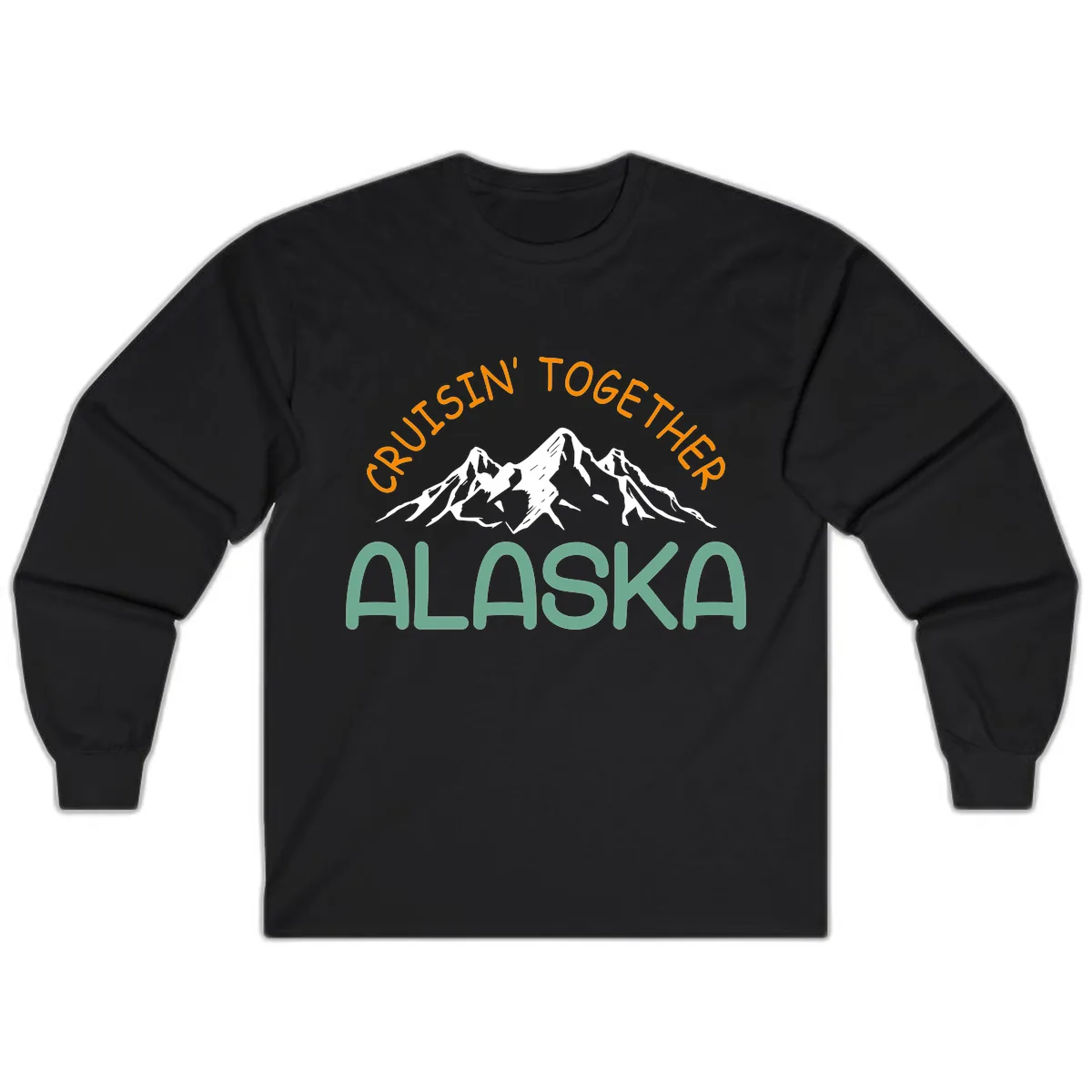 The bold typography design, with 'CRUISIN' TOGETHER' in orange and 'ALASKA' in teal, looks striking on the long sleeve shirt. It maintains the fun, unified message for your group.