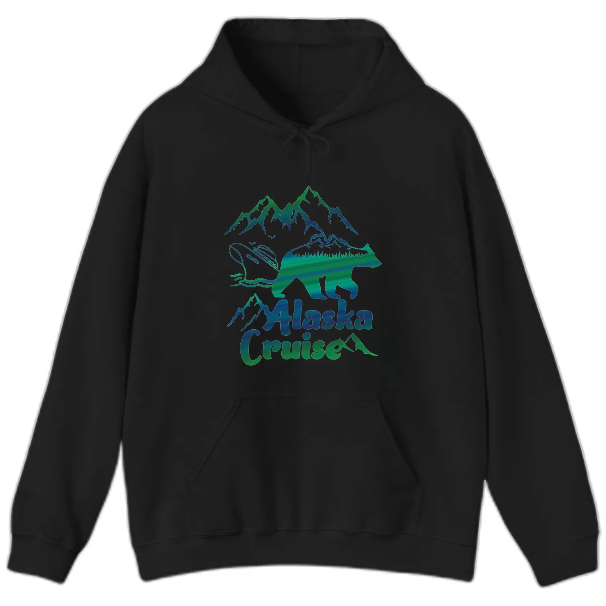 The bold teal-to-green gradient of the 'Alaska Cruise' text is printed vividly on the hoodie, perfectly complementing the intricate bear graphic and adding a stylish finish.