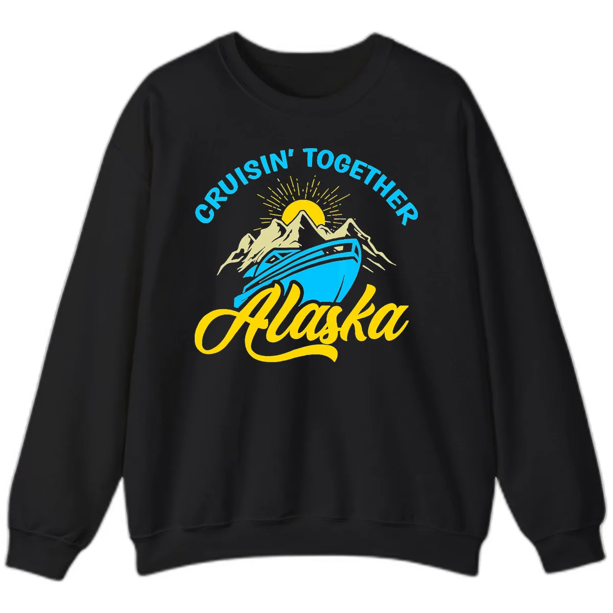 Experience the magic of Alaska in ultimate comfort with the "Cruisin' Together Alaska" Sweatshirt. This cozy sweatshirt features a stunning design of a cruise ship navigating towards majestic snow-capped mountains under a golden rising sun, radiating warmth and adventure. It's the perfect group matching apparel for your unforgettable voyage!