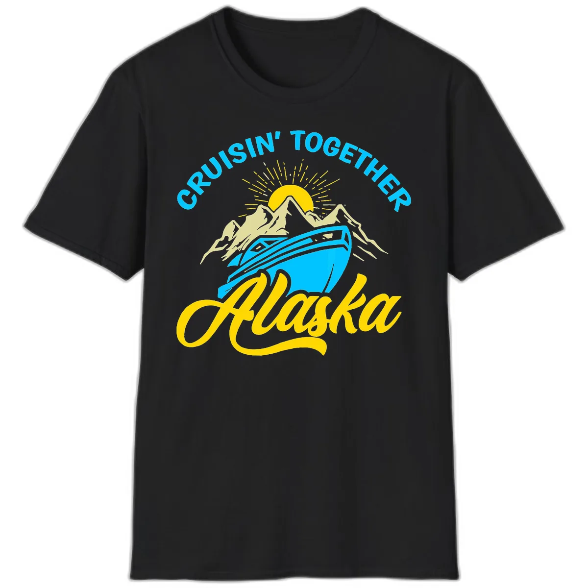 This design features a vibrant illustration of a cruise ship sailing towards majestic mountains under a rising sun. The text 'CRUISIN' TOGETHER Alaska' in cheerful yellow script is ideal for group matching cruise shirts, celebrating your shared adventure.