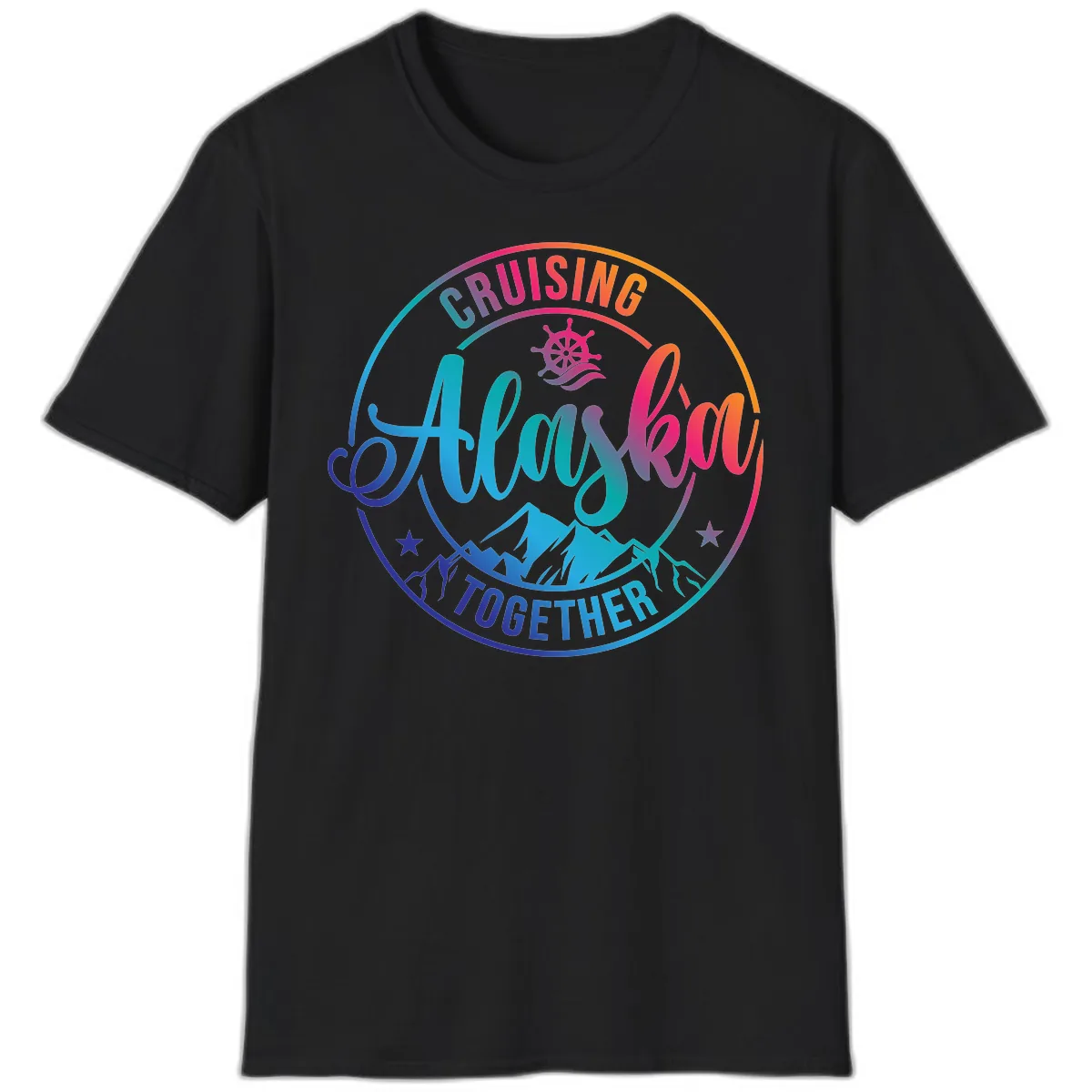 This t-shirt features a vibrant circular badge design with 'Cruising Always Together' in flowing script. It's surrounded by nautical and Alaskan elements like a ship's wheel, mountains, and stars, perfect for group cruises.