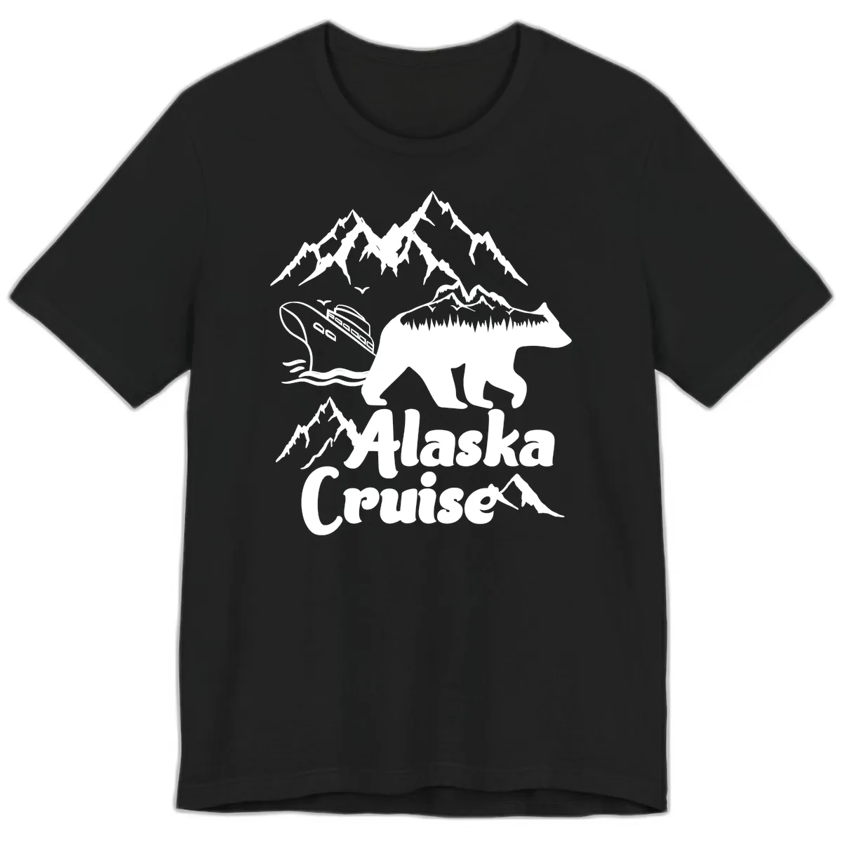 Elevate your cruise wardrobe with the Alaska Cruise Bear Mountain Adventure Premium T-Shirt. This unique design showcases a polar bear silhouette artfully filled with a vibrant Alaskan wilderness scene, complete with towering mountains, dense forests, a rustic cabin, and the iconic cruise ship. Set against a cool gray backdrop with snow-capped peaks above and gentle waves below, this tee is a true work of art.
