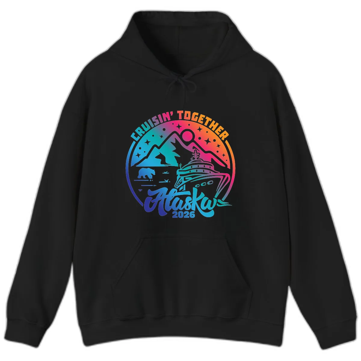 Get ready to conquer the wild in comfort and style with the Cruisin' Together Alaska 2026 Hoodie! This hoodie is designed for your ultimate Alaska adventure, featuring a vibrant circular badge alive with the spirit of the Last Frontier. Picture a sleek cruise ship, majestic snowy mountains, a powerful bear, a leaping fish, and a sprinkle of stars, all set against a stunning rainbow gradient. The bold 'CRUISIN' TOGETHER Alaska 2026' text makes it the perfect rallying point for your entire cruise squad!